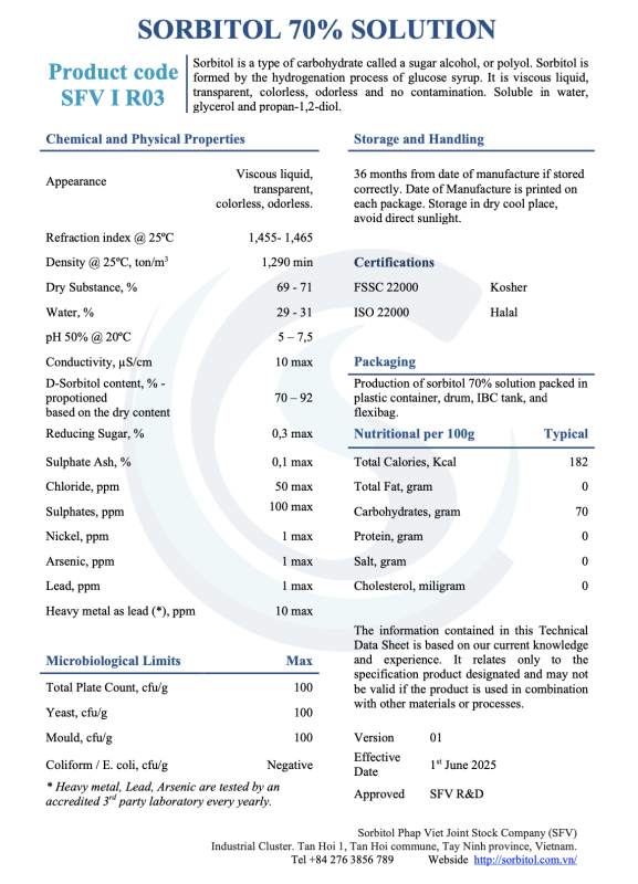 Sorbitol 70% DS is a colorless, viscous syrup with a mild sweetness and low caloric value. It is widely used in the food industry as a nutritive sweetener, while also serving as an effective humectant, stabilizer and texture modifier in a wide range of food applications