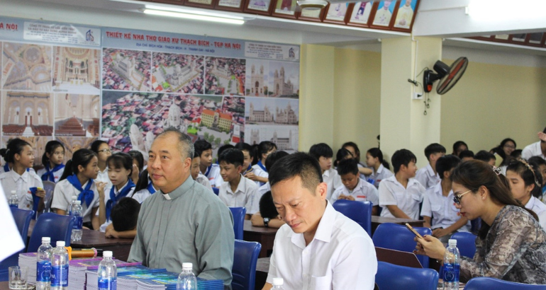 Tham dự buổi tập huấn có sự hiện diện của cha Giám đốc Caritas TGP Hà Nội Gioan Baotixita Nguyễn Văn Quang, cha phó Thạch Bích Phêrô Phạm Văn Hùng, quý Sơ Văn phòng Caritas Hà Nội; ông Lương Lê Quang – Viện trưởng Viện PSD và các chuyên viên Viện PSD, cùng hơn 300 em thiếu niên giáo xứ Thạch Bích.